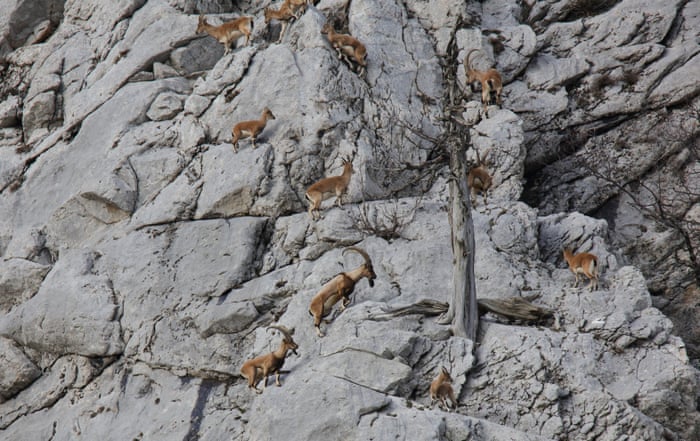 Capra Aegagrus, which are ancestors of the domestic goat and are on the International Union for Conservation of Nature’s red list of threatened species, climb up the side of a mountain.